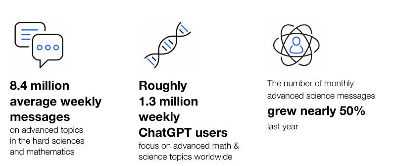 每周,ChatGPT上产生840万条高级科学和数学话题的对话,这些对话来自全球130万活跃用户。2025年,与高级科学相关的消息数暴涨50%。